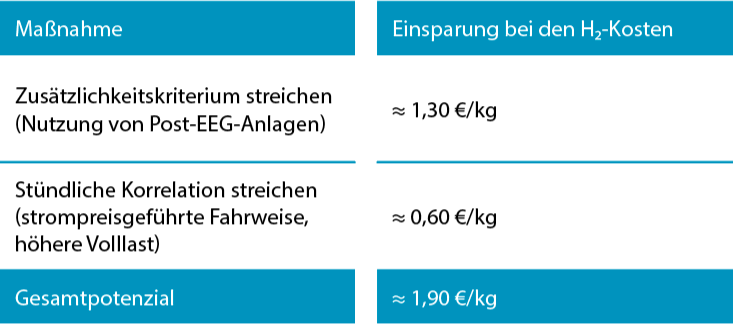 Ohne die Kriterien der Zusätzlichkeit und der Ungefördertheit könnten bestehende Anlagen genutzt werden (insbesondere Post-EEG-Anlagen), wodurch ein neuer Markt für ausgeförderte Anlagen erschlossen würde. Die Kostenersparnis beträgt dann etwa 1,30 €/kg Wasserstoff.