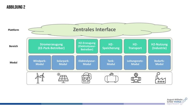 Abb. 2: Schematische Darstellung einer modular aufgebauten digitalen Plattform für die gesamte Wasserstoff-Wertschöpfungskette