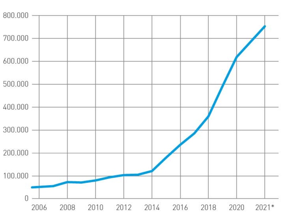 Zur Orientierung, wie stark das Interesse an digitalen Inhalten ist, dient hier die Statistik des Hydrogeit Verlags (s. Abb.): Auf die verschiedenen Internetseiten (www.hydrogeit.de, www.hydrogeit-verlag.de, www.hzwei.info, www.h2-international.com) haben im vergangenen Jahr insgesamt rund 750.000 Besucher zugegriffen – Entwicklung: rasch steigend.