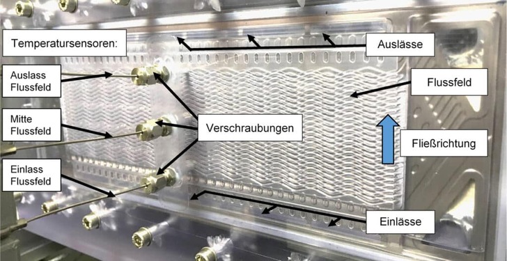 Zur Untersuchung des Wärmeübergangs der modifizierten Bipolarplatten wurde ein Laborprüfstand entwickelt und umgesetzt (s. Abb. 2). Der Messstand wurde derart konzipiert, dass die technischen Bedingungen denen des realen Anwendungsfalls entsprechen und im Bereich realistischer Lastveränderungen variiert werden können. Eine transparente Prozesskammer und eine Bipolarplatte hüllen die Kühlkanäle ein und ermöglichen dabei, ablaufende Strömungs- und Siedeprozesse des Kühlmediums optisch zu erfassen. Zusätzlich wurden mittig in Strömungsrichtung drei abgeschirmte Thermoelemente gleichmäßig über der Bipolarplatte verteilt, welche zur messtechnischen Erfassung der Temperaturverteilung im Kühlmedium genutzt wurden.