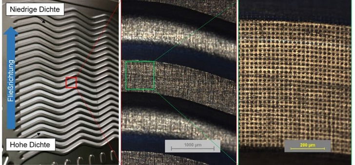 Abb. 3: Strukturierte Bipolarplatte mit in Fließrichtung sinkender Dichte der Mikrostrukturen (links); Detailansicht Wellenstruktur (mittig); Detailansicht Mikrostrukturierung (rechts)