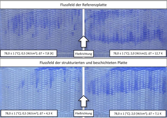 Anhand des Prüfstandes konnte experimentell der Einfluss der Oberflächenfunktionalisierung auf das Phasenübergangsverhalten gezeigt und untersucht werden. Siedevorgänge auf der strukturierten Oberfläche waren hierbei weniger intensiv ausgeprägt als auf der unstrukturierten Referenzplatte (s. Abb. 4). Auch die Messungen mittels der Temperatursensoren bestätigten, dass die maximal auftretenden Temperaturen durch die Oberflächenfunktionalisierung der Bipolarplatte verringert werden konnten. Zudem war die Temperaturverteilung entlang der Strömungsrichtung des Kühlmediums deutlich gleichmäßiger: Die Temperaturerhöhung ∆T entlang der strukturierten und beschichteten Platte war für alle untersuchten Parametersätze im Vergleich zur Referenz-Bipolarplatte geringer.