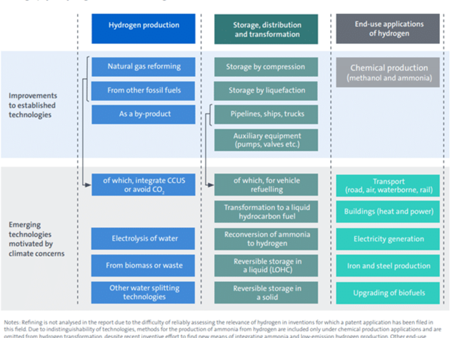 Schwierigkeiten bereiten nach wie vor die Wasserstoffspeicherung im Fahrzeug sowie die Umwandlung der chemisch in Wasserstoff gespeicherten Energie in Antriebskraft. Im Automobil- und Luftfahrtsektor dominieren Patentanträge für Antriebssysteme. Insbesondere machen H2-Brennstoffzellen einen beträchtlichen Anteil der Innovationen der letzten zehn Jahre aus. In der Luftfahrt eignen sich Brennstoffzellen voraussichtlich eher für Kurzstreckenflüge. Bei Langstreckenflügen werden die höhere Turbinenleistung und Energiedichte von wasserstoffbasierten Kraftstoffen vermutlich eine höhere Leistung als die Kombination aus Brennstoffzelle und Motor bieten.