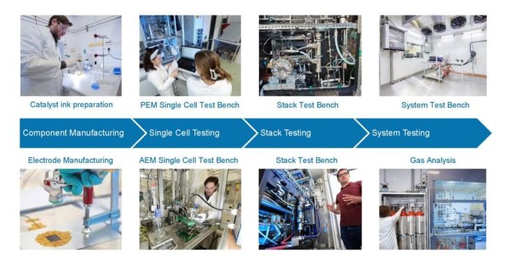 Die verschiedenen Tests, die auf den Prüfständen und in den Laboren durchgeführt werden können, umfassen beispielhaft Qualitätsuntersuchungen, Kalibrierdienstleistungen, Leistungs- und Effizienztests, Sicherheitstests, Lebensdauertests und Tests unter realen Umweltbedingungen. Das 1.200 m² große Testcenter umfasst unter anderem zwei Einzelzellen-Elektrolyseteststände, zwei Short-Stack-Elektrolyseteststände, einen Hochdruckprüfstand bis 1.000 bar mit Klimakammer, zwei Multifunktionsprüfstände, einen BZ-Kathodensubsystemprüfstand, einen BZ-Systemprüfstand bis 160 kW mit Klimakammer, ein Gasanalyselabor, ein analytisches und elektrochemisches Labor, einen elektrochemischen Kompressionsteststand, eine 350- und 700-bar-H2-Tankstelle, eine Testzelle für H2-Permeation und einen Autoklav zur H2-Materialkompatibilitätsbestimmmung von Proben.