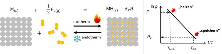Abb. 1: Links: Reaktionsgleichung für die MH-H2-Reaktion. Rechts: Schema der Druck-Temperatur-Korrelation des reversiblen MH-H2-Reaktionssystems.