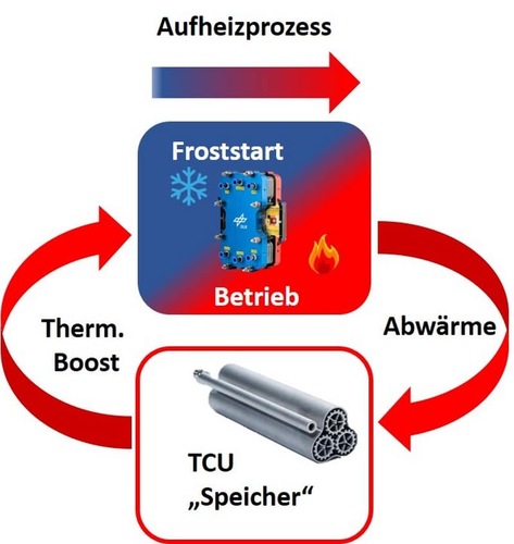 Abb. 2: Schema der Temperaturkontrolleinheit (TCU), die die „Abwärme“ der Brennstoffzelle während des Betriebs für das nächste Froststartereignis speichert.