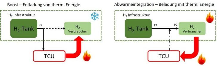 Abb. 3: Schema der Integration der TCU in die H2-Infrastruktur. Links: Thermische Entladung, rechts: Thermische Beladung