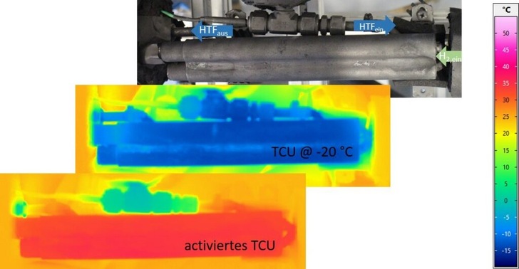 Abb. 5 zeigt Oberflächenaufnahmen des TCU mit einer Thermografiekamera für ein Experiment zum Zeitpunkt des Starts bei -20 °C sowie im aktivierten Zustand, nachdem ein H2-Druck von 8 bar angelegt wurde.