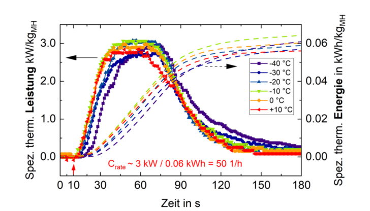 Nach etwa 100 s ist die gesamte im Metallhydrid gespeicherte Wärmeenergie freigesetzt, wie die auf der rechten Achse des Diagramms in Abbildung 7 angegebene spezifische Wärmeenergie zeigt. Mit den vorliegenden Experimenten konnte eine Entladerate oder auch C-Rate des Moduls von ~ 50 h-1 – selbst bei Starttemperaturen von -40 °C – nachgewiesen werden.