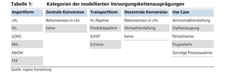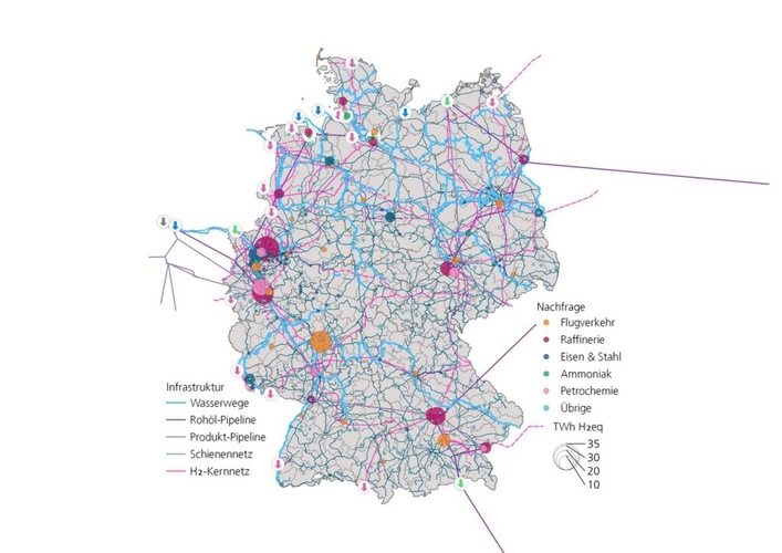 Insgesamt sind es 543 Nachfragestandorte in Deutschland, die in diese Analyse eingeflossen sind. Sie wurden den verschiedenen Anwendungsfällen zugeordnet und hinsichtlich der Versorgungsmöglichkeiten mit Wasserstoff und dessen Derivaten untersucht. Anwendungsfälle – das sind die Herstellung von Ammoniak, Stahl, petrochemischen Basischemikalien und synthetischen Flugturbinenkraftstoffen. Außerdem zählen die Bereitstellung von Prozesswärme in der Metallerzeugung und -bearbeitung, die Herstellung von Glas und Keramik sowie die Papierindustrie dazu. Als Transportwege berücksichtigt die Studie Binnenschifffahrtsstraßen, Schienennetz, Wasserstoffkernnetz und Produktpipelines. So listet die Studie je Anwendungsfall die ökonomischen Vor- und Nachteile der jeweiligen Optionen auf.