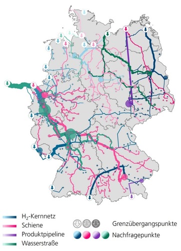 Das H2-Kernnetz spielt eine wichtige Rolle in der Versorgung der Industrie. Die Studie weist darauf hin, dass alle identifizierten Standorte potenzieller Wasserstoffgroßnachfrager im Jahr 2035 durch das Wasserstoffkernnetz erreicht werden. Aber: Der Transport von Wasserstoff (-derivaten) per Binnenschiff oder Bahn stellt in vielen Fällen eine mögliche Alternative oder Ergänzung zur pipelinegebundenen Standortversorgung dar.