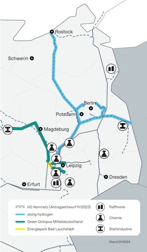 Bis 2032 soll das Wasserstoffkernnetz in Betrieb gehen. Dazu sollen Erdgasleitungen auf Wasserstoff umgestellt werden und auch neue Wasserstoffleitungen entstehen. Gasnetzbetreiber Ontras bringt sich mit seinem H2-Startnetz in das Projekt ein. Es besteht unter anderem aus den beiden IPCEI-Projekten „Green Octopus Mitteldeutschland“ und „doing hydrogen“. Damit will Ontras den Grundstein für den effizienten und sicheren Wasserstofftransport in seinem Netzgebiet legen. Das ostdeutsche Unternehmen verbindet über seine Infrastruktur die gesamtdeutschen mit den europäischen Netzen – dem European Hydrogen Backbone. Über dieses soll in Skandinavien produzierter Wasserstoff nach Deutschland gelangen.