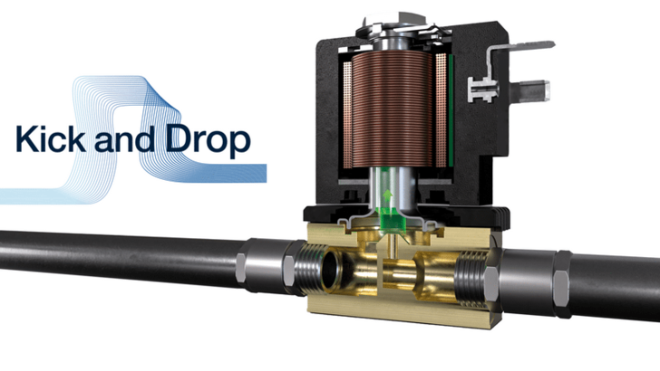 Bürkert stellt bei seinem Messeauftritt die neue Spulentechnologie Kick and Drop in den Mittelpunkt. Diese Technologie soll in Ventilen bis zu 80 Prozent Energieeinsparung, 45 K geringere Eigenerwärmung und 200 Prozent mehr Schaltdruck im Vergleich zu herkömmlichen Spulen erreichen. Die Kick-and-Drop-Spule ist mit einer Doppelwicklung mit Anzugs- und Haltewicklung ausgestattet. Bei der Kick-and-Drop-Elektronik wird durch einen hohen Stromimpuls die Spule übererregt. Dadurch wird die benötigte Anzugskraft, welche das Ventil zum Öffnen benötigt, erzeugt. Nach rund 500 Millisekunden schaltet die Kick-and-Drop-Elektronik in einen energiesparenden Haltebetrieb. Dabei wird die Leistungsaufnahme drastisch gesenkt.