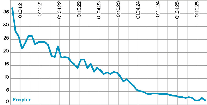 Hydrogenpro ASA Ein alkalischer Hochdruckelektrolyseur ist das Hauptprodukt des auf Wasserstoff und erneuerbare Energien spezialisierten Unternehmens. Hauptaktionäre sind die österreichische Andritz AG und Mitsubishi Heavy Industries aus Japan. Im Jahr 2024 lag der Verlust mit rund 196 Millionen NOK genauso hoch wie der Umsatz, der ein Jahr zuvor noch bei 568 Millionen NOK lag. In den ersten drei Quartalen des Jahres 2025 fiel der Umsatz um 44 Prozent auf rund 70,1 Millionen NOK, während der Verlust für die Aktionäre um 27 Prozent auf rund 194 Millionen NOK stieg.