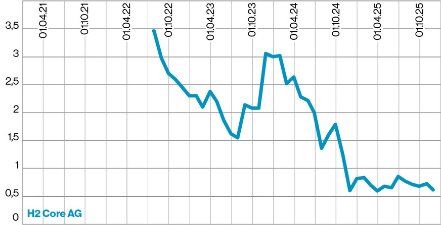 H2 Core AG Die aus der Marna Beteiligungen AG hervorgegangene H2 Core AG bietet H2-basierte „Plug-and-Play-Energieversorgungslösungen“ mit Hilfe von Elektrolyse-Stacks, die vor allem von Enapter AG geliefert werden. Mitte 2024 wurden rund 325.000 neue Aktien der H2 Core AG zu je 2,20 Euro ausgegeben. Inzwischen liegt der Kurs rund 70 Prozent tiefer. Das Unternehmen geriet 2025 mit der Veröffentlichung der Umsatzzahlen in Verzug und schreibt weiterhin Millionenverluste.
