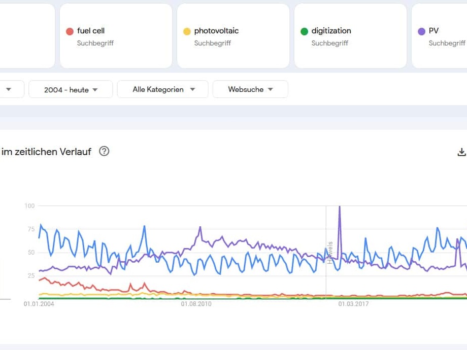 Sehr plakativ lässt sich mit diesem Tool veranschaulichen, wie groß das Interesse an gewissen Themen war und ist. So ist unter anderem zu erkennen, dass das Keyword „Wasserstoff“ seit Ende 2018 deutlich häufiger gegoogelt wird als in den 15 Jahren zuvor. In den Jahren 2020 und 2021 gab es jeweils Peaks. Insgesamt ist die Popularität dieses Begriffs seitdem auf einem relativ hohen Niveau.