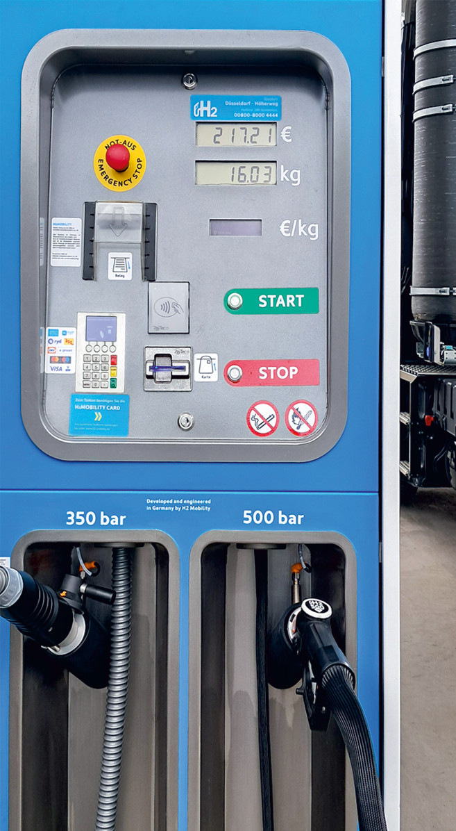 Hier kann nicht nur Wasserstoff mit 350 bar (Busse und Lkw) sowie 700 bar (Pkw) getankt werden, sondern auch mit 500 bar, gekühlt auf –20°C. Letzteren gibt es in einer Test- und Pilotphase zum Preis von 350-bar-Wasserstoff. Aktuell werden Preise zwischen 13,55 Euro/kg (350 und 500 bar) und 15 Euro (700 bar) an der Düsseldorfer Tankstelle aufgerufen. Allerdings, und das muss man bei H2 Mobility einräumen, sind dies Werte nahe dem Einkaufspreis.
