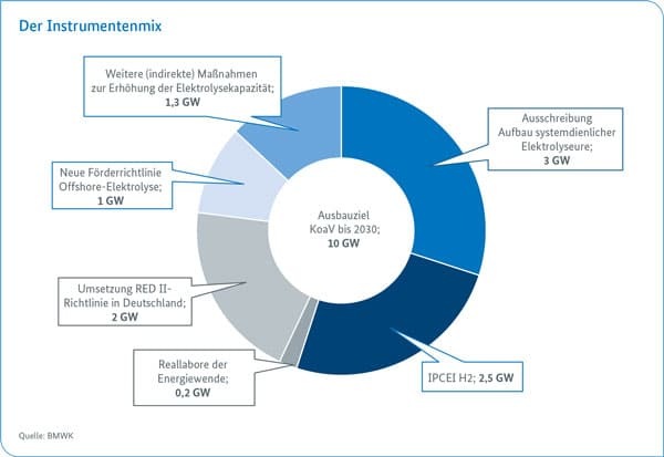 Die erklärten Ziele bis 2030 sind insbesondere ein beschleunigter Markthochlauf von Wasserstoff sowie die Sicherstellung einer ausreichenden Verfügbarkeit von Wasserstoff und seiner Derivate. Dementsprechend wurde die bislang angepeilte Elektrolysekapazität von 5 GW auf mindestens 10 GW erhöht. Der restliche Bedarf wird durch Importe gedeckt, wofür noch eine gesonderte Importstrategie entwickelt werden soll. Zudem soll eine leistungsfähige Wasserstoffinfrastruktur aufgebaut werden. Bis 2027/2028 soll mit Hilfe von Fördergeldern aus Brüssel ein H2-Startnetz mit mehr als 1.800 km auf den Weg gebracht werden. Dieses wird teils umgewidmete Erdgasleitungen sowie neu gebaute Wasserstoffleitungen beinhalten. Es wird Bestandteil des europaweit geplanten European Hydrogen Backbone sein, der H2-Pipelines mit einer Gesamtlänge von ca. 4.500 km umfasst.