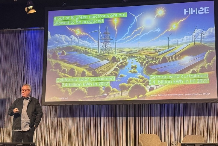 „Wussten Sie, dass wir allein mit dem Windstrom, der im ersten Halbjahr 2022 abgeregelt wurde, 1,5 Millionen Haushalte in Europa ein Jahr lang mit Strom hätten versorgen können?“ (Die Zahl bezieht sich auf durchschnittliche Haushalte mit einem Verbrauch von 3.500 kWh pro Jahr). Das war eine von mehreren Fragen, mit denen Alexander Voigt, Geschäftsführer von HH2E, seinen Vortrag begann. „Was können wir mit all den grünen Elektronen machen, die nur deshalb nicht erzeugt werden, weil das Stromnetz sie nicht aufnehmen kann?“ Seine Antwort, natürlich: Wasserstoff! Aber auch Hochleistungsbatteriespeicher, um Energie zur Stabilisierung des Stromnetzes anbieten zu können. So erklärte er das Geschäftsmodell des geplanten HH2E-Werks in Lubmin. Es werde überschüssigen Strom nutzen, um „zuverlässig und kostengünstig grünen Wasserstoff zu erzeugen“. Hinzu komme CO2-freie Wärme und bei Bedarf die Rückverstromung der „grünen Moleküle“.