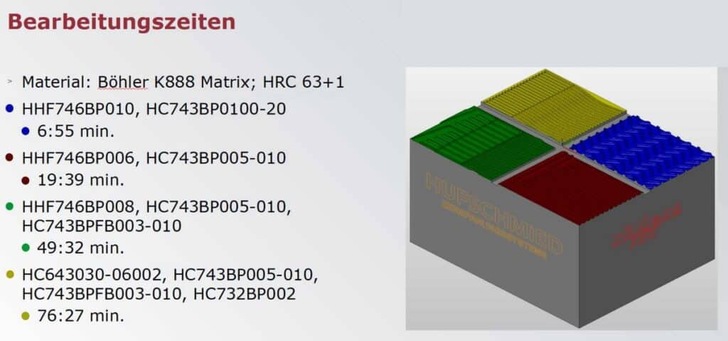 Die zur Bearbeitung der verschiedenen Segmente des Demonstrators (50 mm x 40 mm) auf der Röders-Anlage eingesetzten Hufschmied-Werkzeuge der Bumble-Bi-Reihe sowie die entsprechenden Bearbeitungszeiten, Quelle: Röders/Hufschmied