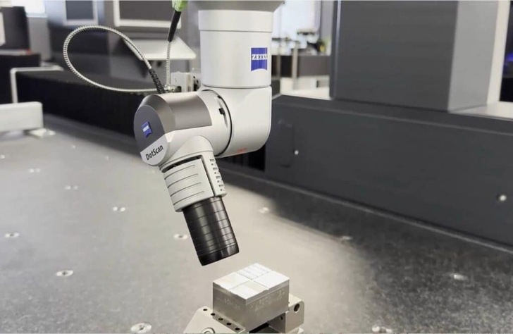 Messung des Demonstrators mithilfe des optischen Sensors Typ Zeiss DotScan mit MPE von 1,8 µm + L/350. Um die Flanken besser messen zu können, wurde er mit einer Dreh-Schwenkeinheit des Typs RDS und auf einem Zeiss-„Contura“-Koordinatenmessgerät über die Probe geführt. Quelle: Zeiss