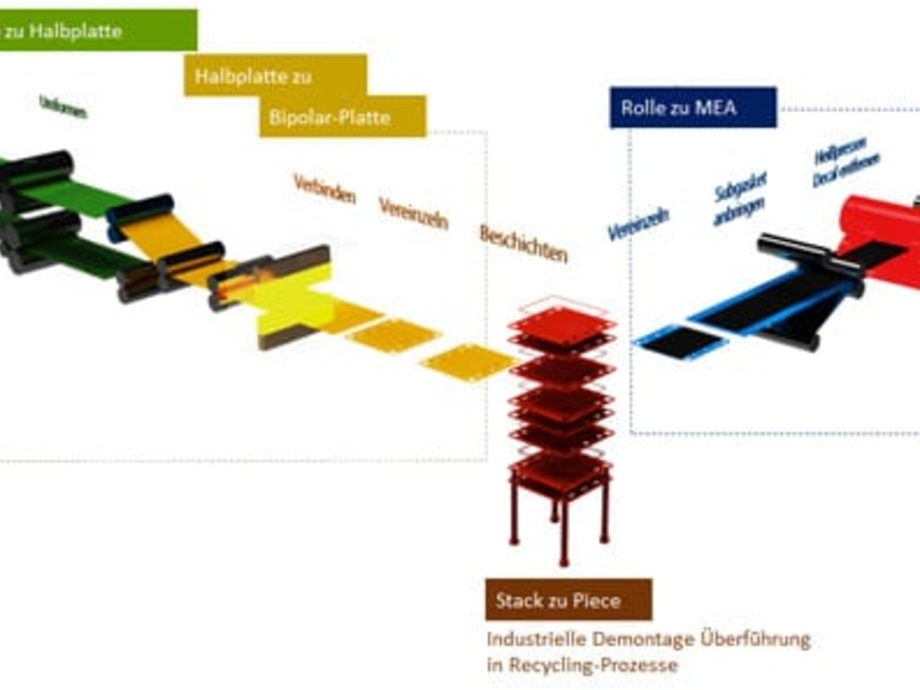 Weitere Prozessschritte sind laserbasierte Schneid- und Fügeprozesse sowie schließlich ein spezielles Prüfverfahren, das die Herstellung der BPP abschließt (HP2BPP). Kombiniert wird diese mit einer MEA, die durch eine Decal-Beschichtung mit Siebdruck oder Schlitzdüse hergestellt wurde (R2MEA).
