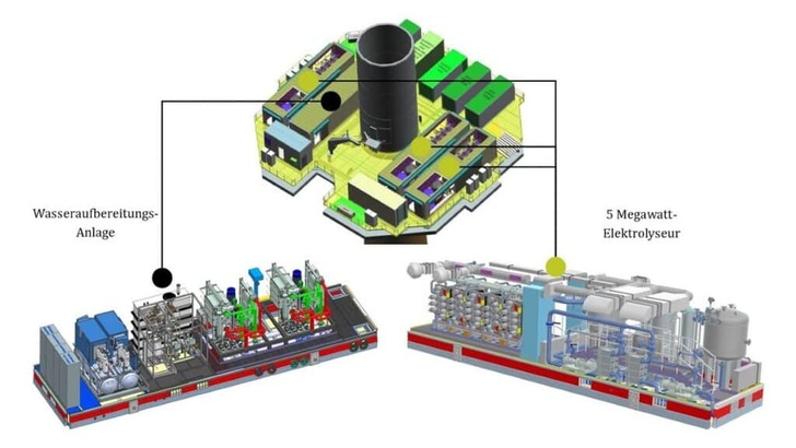 Wie eine Windenergieanlage mit integrierter Wasserstoffproduktion aussehen würde, hat H2Mare ebenfalls bereits analysiert: In Zukunft könnten alle notwendigen Anlagen auf einer Plattform direkt bei einer Offshore-Windenergieanlage untergebracht sein.