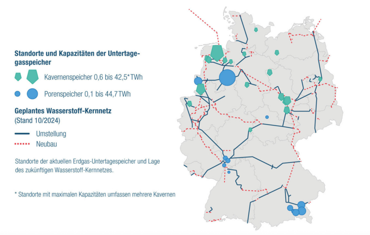 Deutschland verfügt über rund 25 Prozent der Untergrundgasspeicherkapazitäten in der EU. Ein Großteil der bestehenden Erdgasspeicher kann technisch auf Wasserstoff umgestellt werden. Die Umrüstung eines Kavernenspeichers dauert laut Studie etwa sechs Jahre, ein Neubau hingegen rund elf Jahre. Bei Porenspeichern liegt die Umrüstungsdauer bei acht Jahren, der Neubau dauert etwa zehn Jahre. Dennoch wird die Kapazität der umgerüsteten Speicher nicht ausreichen. Je nach Szenario könnten bis 2045 zusätzliche Wasserstoffspeicher mit einem Volumen von über 40 Terawattstunden nötig sein.