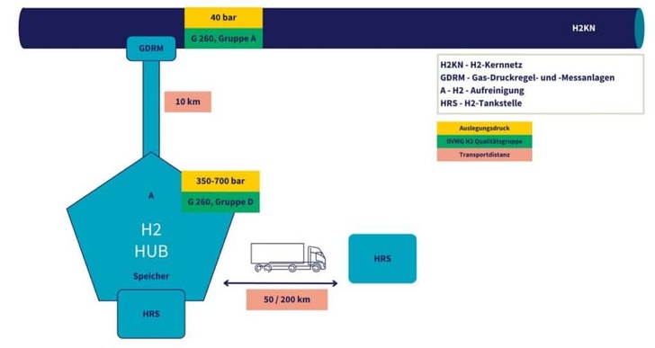 HRS-Versorgung per Trailer von einem H₂-Hub, der an das H₂-Kernnetz angeschlossen ist. Dies ist die in der Studie präferierte Anbindungsoption an das H₂-Pipeline-Netz.