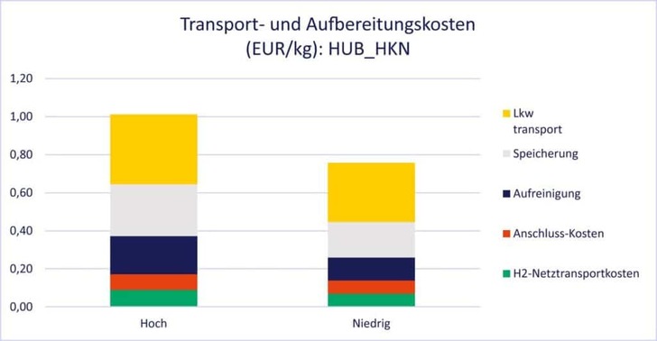 Spezifische Transport- und Aufbereitungskosten für H₂-Versorgung per Trailer von einem H₂-Hub mit Anschluss an das H₂-Kernnetz: Kostenbestandteile in zwei unterschiedlichen Szenarien der präferierten Anbindungsoption für 2030.