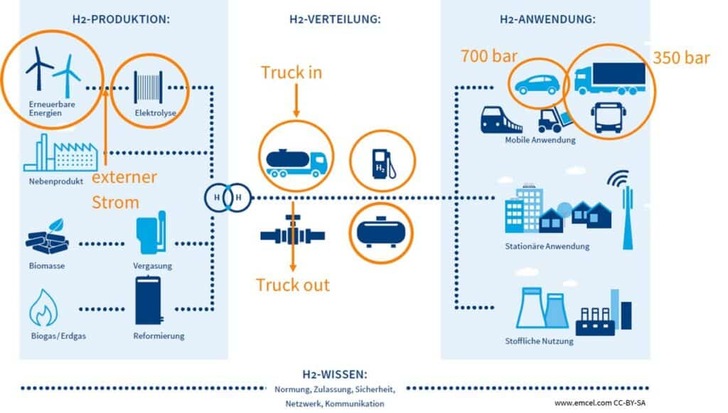 Abb. 2: Die H2-Wertschöpfungskette – von der H2-Erzeugung aus Erneuerbaren bis zum Flottenbetrieb. In Orange sind die wesentlichen Bausteine hervorgehoben.