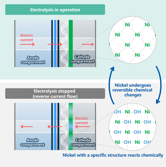 Als Alternative zu einer mechanischen Lösung hat Asahi Kasei nun eine Umkehrstrom-Absorptionsschicht mit einer Nickelbeschichtung entwickelt. Wenn der Elektrolyseprozess gestoppt wird, geht diese Schicht eine chemische Reaktion mit dem Nickel ein. Das verhindert die Zersetzung der Kathode verhindert. Die nickelbeschichtete Rückstrom-Absorptionsschicht hat eine hohe Porösität, ist robust und gut auch auf großen Flächen zu verarbeiten, so Ahasi Kasei.