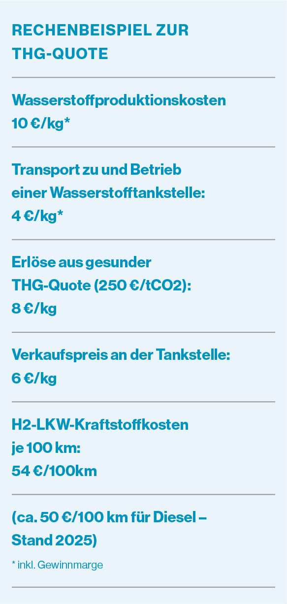 Der THG-Quotenhandel ermöglicht den wirtschaftlichen Betrieb von Wasserstoffprojekten, ohne dass die Gestehungskosten durch staatliche Investitionsförderungen gering gehalten werden müssen. Der Quotenhandel führt zu Zusatzerlösen beim Verkauf von klimaneutralem Wasserstoff und senkt somit die Verkaufspreise, auch bei höheren Gestehungskosten. Dies erhöht die Akzeptanz bei den Verbrauchern.