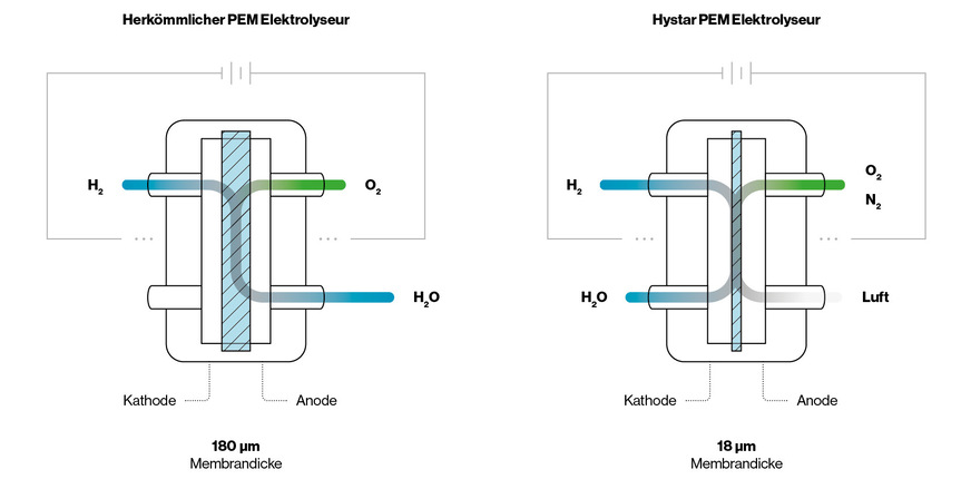 Hystar hat mit seinem patentierten Prozess einen Kniff gefunden, die Dicke der Membranen der PEM-Elektrolyseure von üblicherweise etwa 180 Mikrometern auf 18 Mikrometer zu reduzieren. Wasser wird dabei auf der Seite der Kathode zugeführt, wodurch die Anodenseite frei bleibt. Damit ergibt sich die Möglichkeit die Anodenseite zu spülen und potenzielle Wasserstofflecks über die Membran zu verdünnen. Dies ermöglicht eine sichere Kontrolle der Diffusion von Wasserstoff über die Membran und erlaubt es, die Dicke der Membran zu reduzieren, welche in herkömmlichen Systemen als Diffusionshindernis verwendet wird. Der Wasserstoff entsteht weiterhin auf der Kathodenseite so wie in herkömmlichen PEM-Elektrolyseuren. Die dünne Membran verringert den Widerstand für die Produktion von Wasserstoff deutlich und steigert somit die Effizienz der Zelle und des gesamten Stacks.