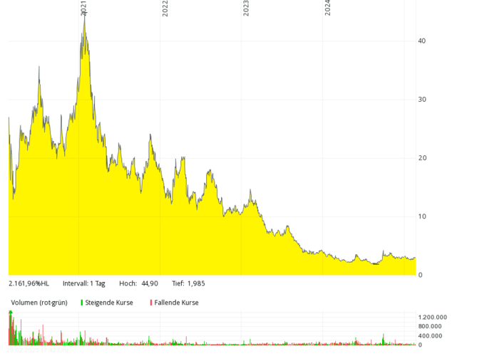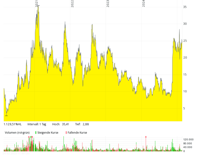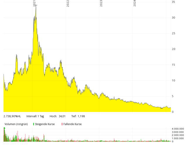 Ein Trauerspiel ist die Aktie des nach Nikola Tesla benannten US-Unternehmens mit Sitz in Phoenix, Arizona. Schon bei der Präsentation des ersten „wasserstoffbetriebenen“ Lkw stellte sich heraus, dass das Werbevideo ein Fake war (man zeigte einen fahrenden Nikola-Lkw, der nicht mit Wasserstoff betrieben wurde). Es gibt Kooperationen mit deutschen Unternehmen und mit der norwegischen Nel (für ein Wasserstofftankstellen-Netz in den USA). Nach einem Hype mit Kursen von über $ 80 (split-bereinigt wären das rund $ 2.000 gewesen) und gerichtlichen Verurteilungen des ersten CEO ist die Aktie nun ein Pennystock. Der Börsenwert ist von seinerzeit zig Milliarden Dollar auf rund 50 Mio. geschrumpft, was nicht verwunderlich ist: 2023 verbuchte man bei nicht einmal $ 36 Mio. Umsatz einen Rekordverlust von über $ 864 Mio.