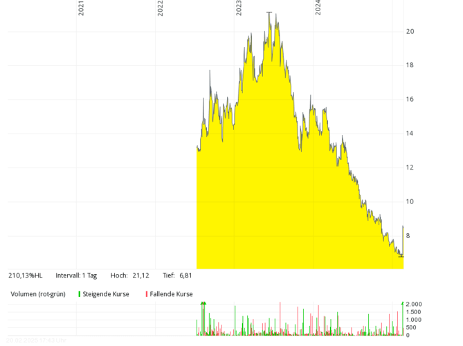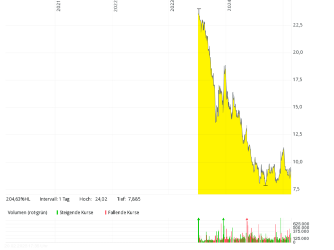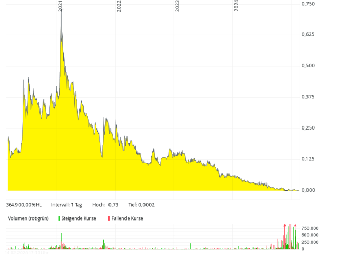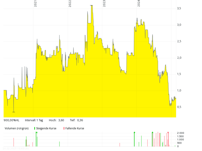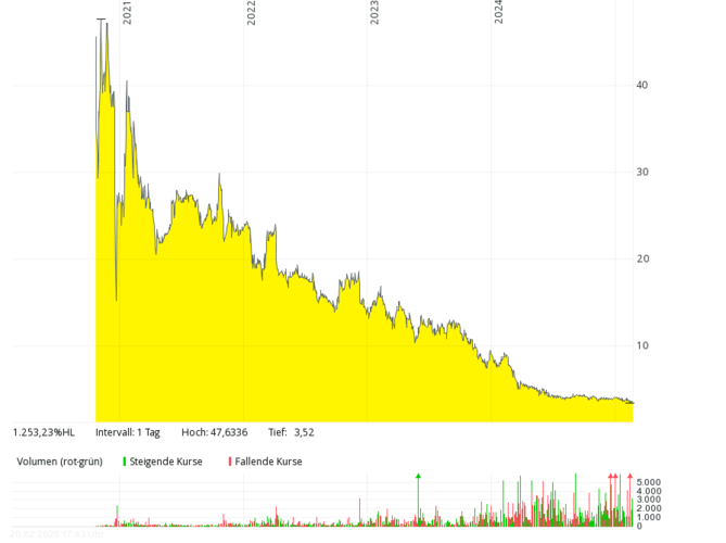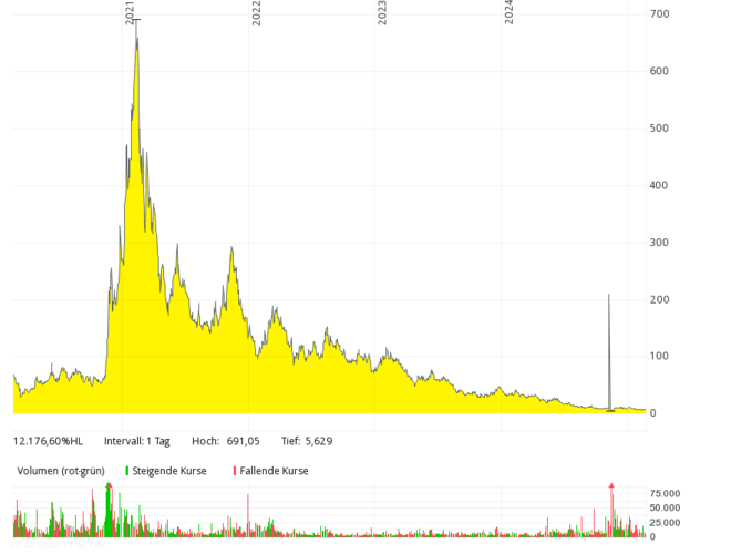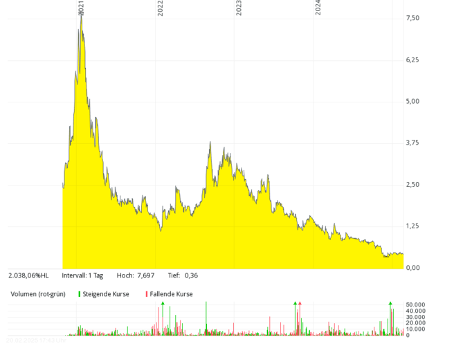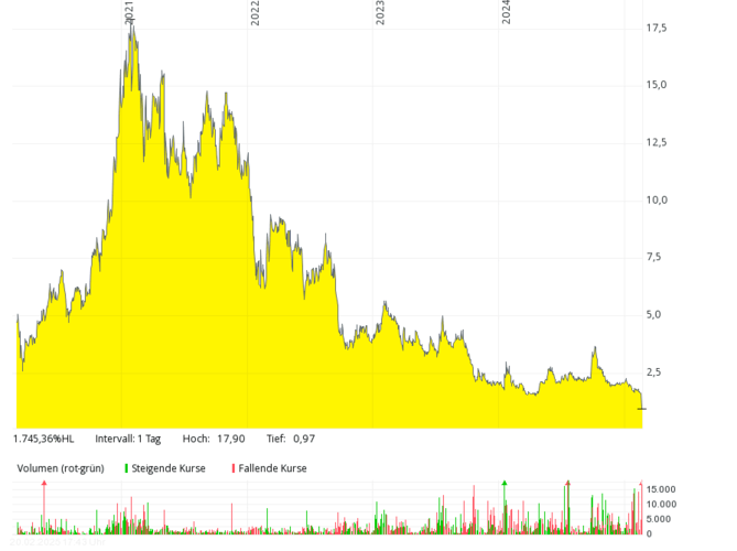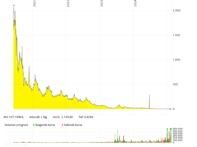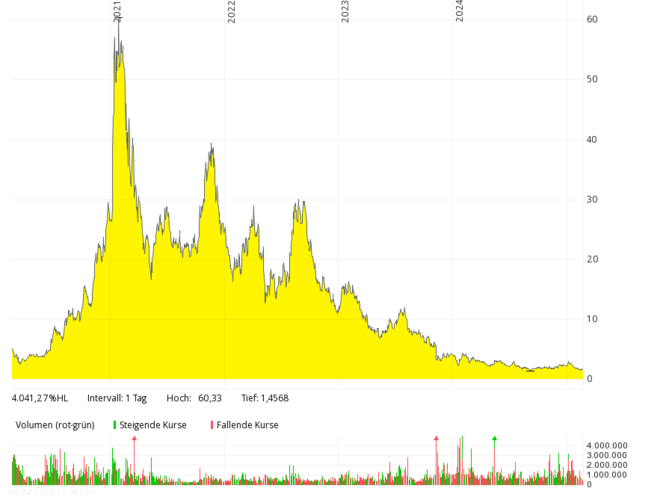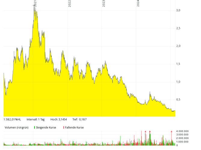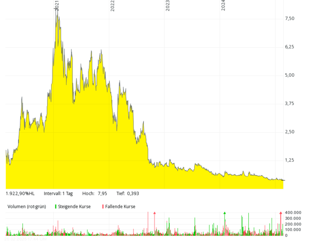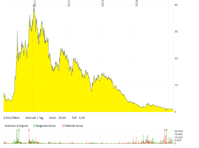 Das britische Brennstoffzellen-Unternehmen mit der deutschen Tochter Proton Motor Fuel Cell GmbH, das auch Produkte im Bereich Wasserstoff entwickelt, kam in den letzten sieben Jahren kaum über Jahresumsätze von über 2 Mio. Pfund hinaus, 2018 und 2019 waren es nur jeweils rund 0,8 Mio. Pfund – bei jeweils meist viel höheren, oft zweistelligen Millionenverlusten. Die Eigenkapitalquote ist schon seit vielen Jahren negativ. Der Kurs sank von über 50 Pence (Anfang 2021) um mehr als 99 Prozent auf rund 0,1 Pence (Februar 2025). Um Kosten zu sparen, hat das Management Ende 2024 überlegt, die Aktie bald von der Börse zu nehmen.