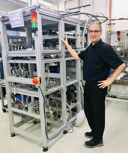 Abb. 3: Sebastian Altmann, Leiter des BZ-Labors (Senior Expert Fuel Cell Lab), vor einem modularen Teststand für Brennstoffzellensysteme, der am ZAL entwickelt wurde