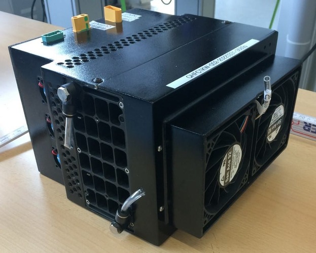 Bild: Kompaktes BZ-System mit 1.000 W Dauerleistung. Rechts im Bild sind die Ventilatoren für die Luftkühlung zu sehen. Der Schlauch zwischen den Ventilatoren dient zum Purgen mit Stickstoff.