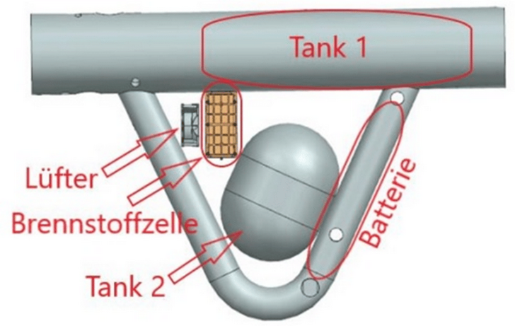 Durch die Verkleinerung der Batterie von 2,5 kWh auf 0,35 kWh verringert sich deren Gewicht von rund 14 kg auf nur noch etwa 2 kg. In Summe ergeben sich etwa 16 kg, die sich auf Brennstoffzelle (4 kg), Tank (9 kg), Batterie (2 kg) und weitere Komponenten (1 kg) wie DC-DC-Steller und Verbindungskomponenten verteilen. Der H2-Drucktank ist dabei nicht nur die größte, sondern auch die schwerste Komponente. Das liegt vor allem an den hohen Sicherheitsanforderungen für den Einsatz im Straßenverkehr.