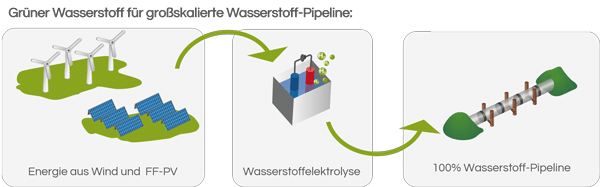 Die H2-Erzeuger gewährleisten in der Initialphase eine wirtschaftliche H2-Produktion durch die intelligente Kombination der Energie aus eigenen Wind- und PV-Freiflächenanlagen, die die Elektrolyseure mit CO2-freier Energie versorgen. Durch die eigenen EE-Anlagen der H2-Erzeuger ist hier eine langfristige, planbare Stromversorgung mit festen Preisen gewährleistet.