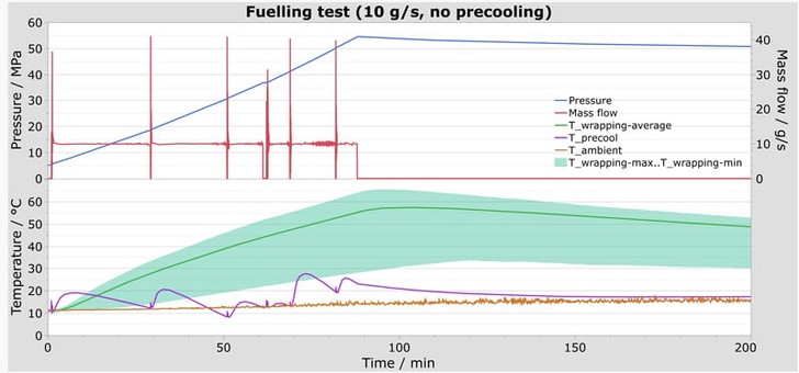 Bei der Befüllung umfassten die variierten Betriebsparameter neben der Temperatur der Vorkühlung des einströmenden Wasserstoffs auch den Startdruck des Speichers sowie die Befüllgeschwindigkeit. Hierbei stand im Vordergrund, den Tank nicht mit den üblichen geregelten Druckrampenraten zu befüllen, sondern die Betankung mit einem konstanten Massenstrom durchzuführen.