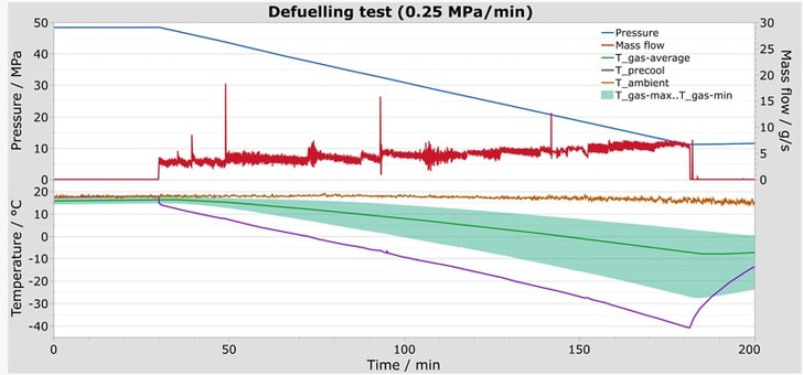 Es konnte beobachtet werden, dass auch bei Entleerungen mit geringen Massenströmen eine starke Auskühlung des Speichers, nachvollziehbar über die Temperatur des ausströmenden Gases, auftritt. Die Tests wurden bei Umgebungstemperaturen von etwa 10 bis 15 °C durchgeführt, womit sich besonders für die Entleerung solcher Speicher bei kälteren Umgebungsbedingungen mitunter starke Einschränkungen in Bezug auf die maximalen Entleerungsgeschwindigkeiten ergeben.
